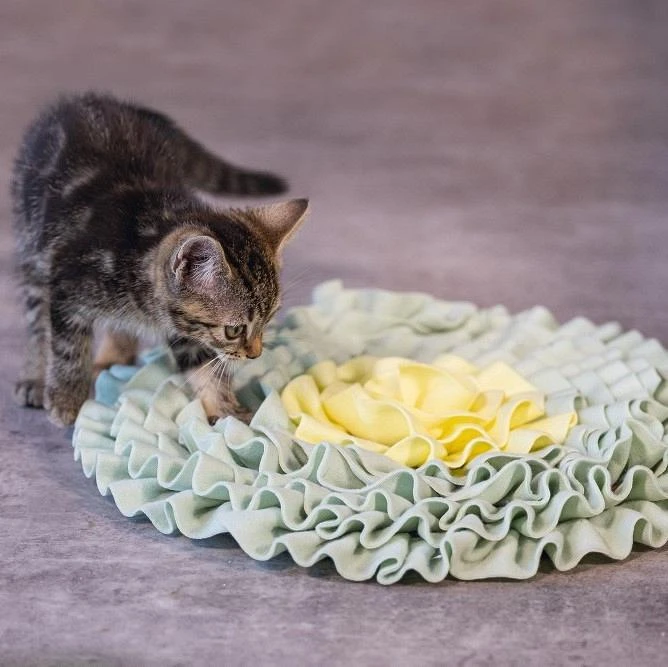 Snuffelmat Flowie is gemaakt van zacht materiaal. Sta er dus niet van te kijken als jouw kitten na zijn speurtocht, heerlijk gaat uitrusten op zijn of haar snuffelmat.