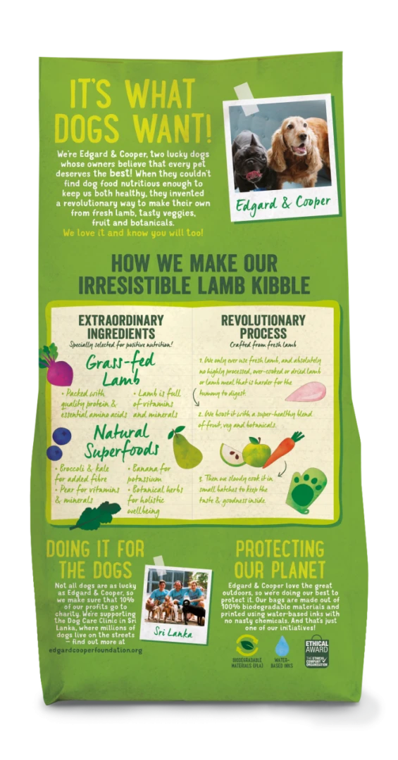 In Edgard & Cooper hondenvoer Adult graslam wordt enkel vers graslam gebruikt en absoluut geen bewerkte, overgare of gedroogde lam of lamsmeel dat moeilijker is voor de buikjes om te verteren. Daarnaast wordt er een supergezonde mix van fruit, groenten en kruiden toegevoegd.