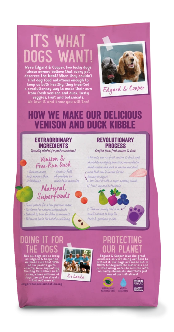 Graanvrij hondenvoer met vers hert en verse scharreleend voor volwassen honden.