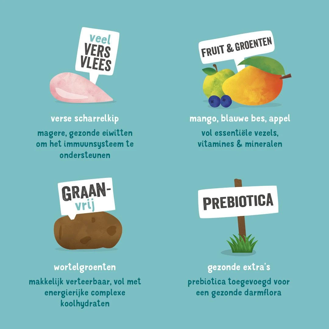 Hypoallergeen en graanvrij hondenvoer met verse scharrelkip voor volwassen honden.
