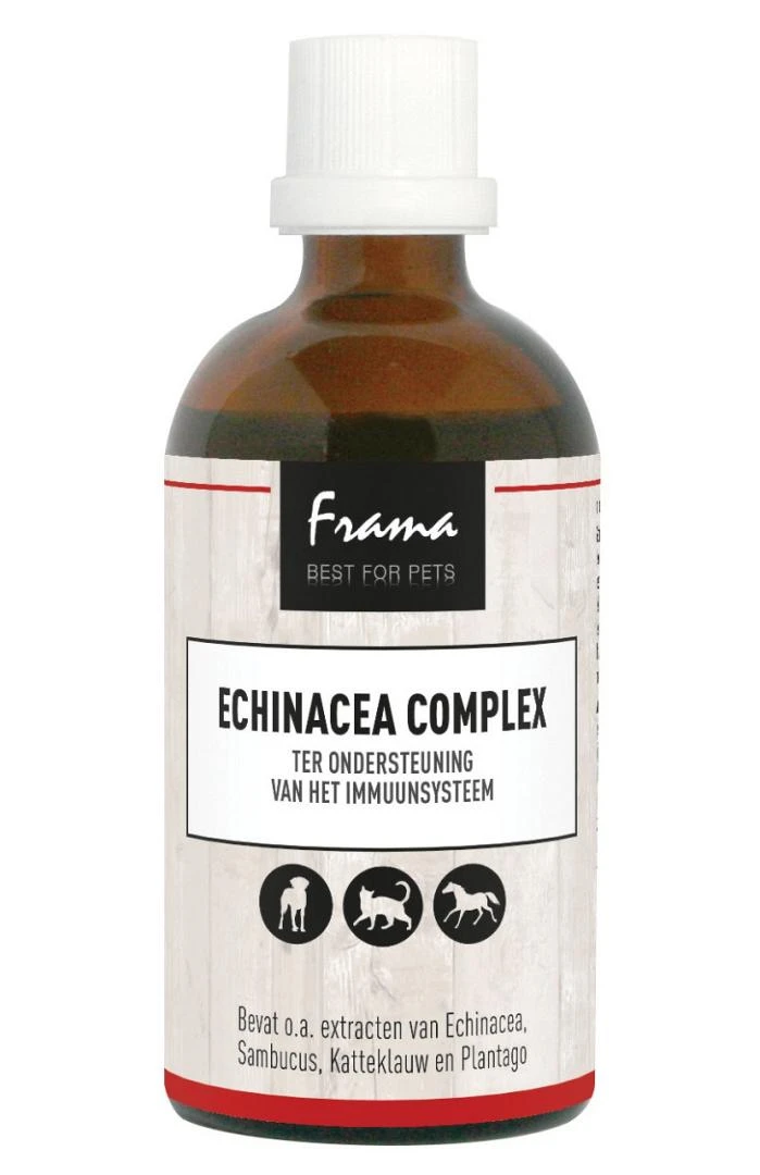 Frama Best For Pets Echinacea Complex werkt ter ondersteuning van het immuunsysteem. Het bevat o.a. extracten van Echinacea, Sambucus, Katteklauw en Plantago.
