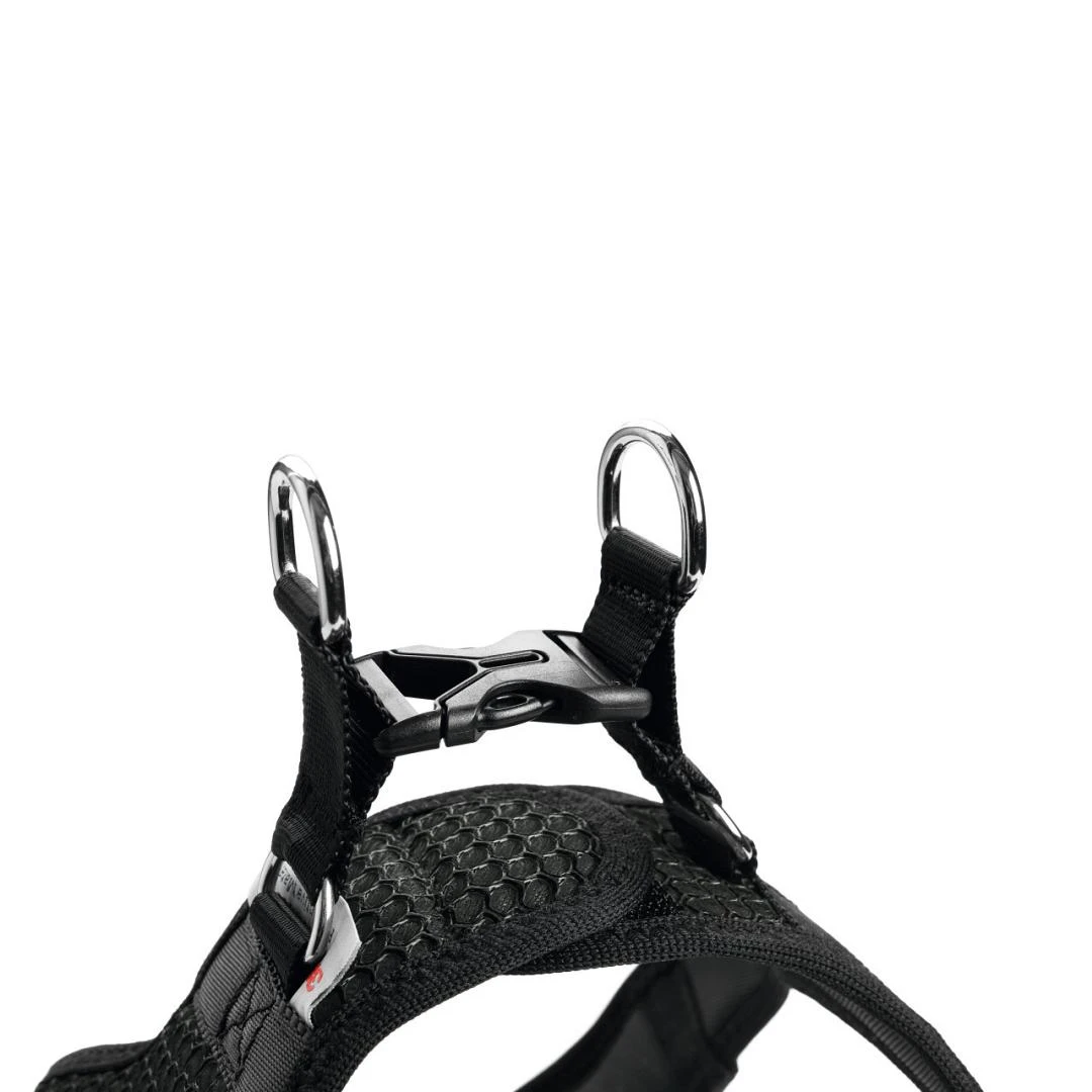 Door de knuffelige pasvorm is de bewegingsvrijheid vrijwel onbeperkt. Er zit geen storend riemmateriaal tussen de voorpoten. Het 3D mesh-materiaal is niet alleen luchtdoorlatend en zacht, maar kan zelfs, gedrenkt in koud water, voor een verkoelend effect zorgen op warme dagen. Het beweegbare gebied tussen het harnas en de twee bevestigingsringen zorgt ervoor dat de trekkracht van de lijn over het hele harnas wordt verdeeld, waardoor de belasting van de gesp wordt ontlast.