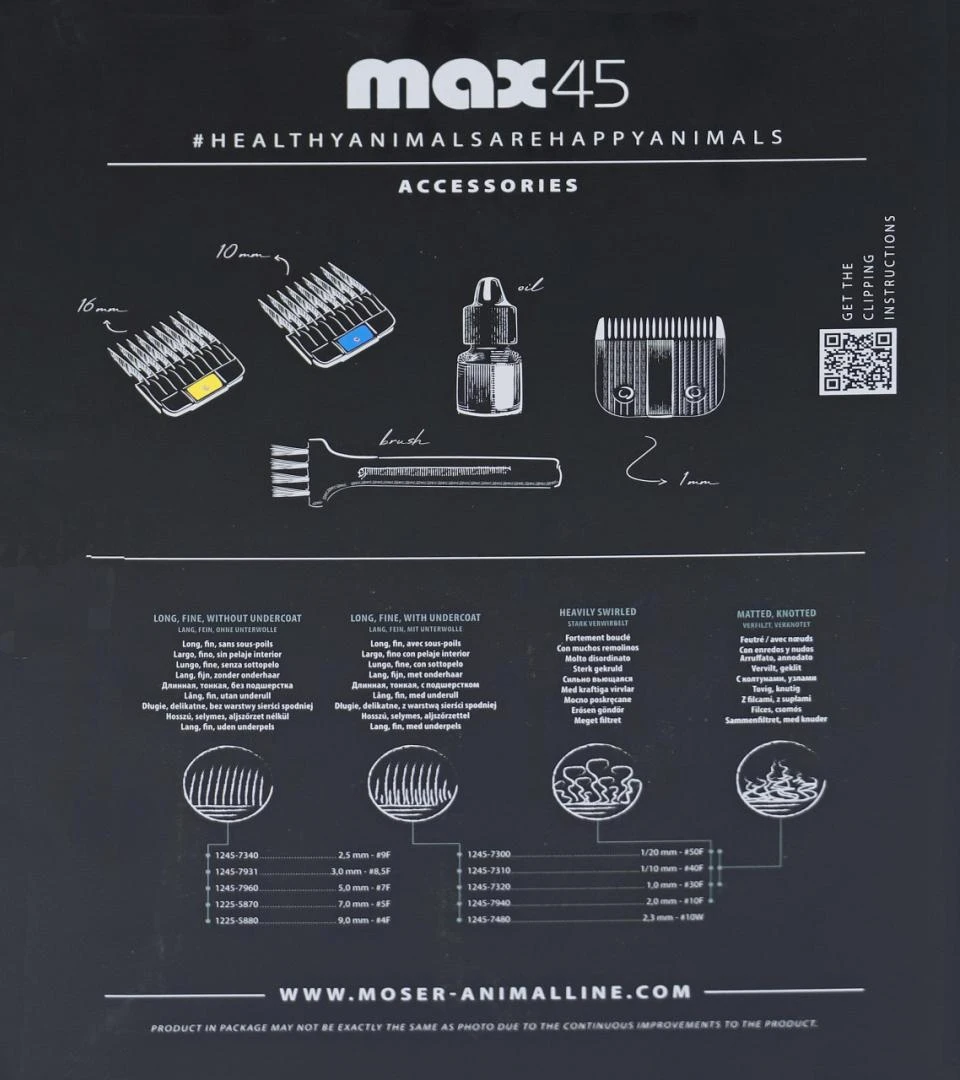 Moser tondeuse Max 45 is een professionele tondeuse met snoer, geschikt voor alle hondenrassen. Het snijmes is voorzien van een snelwissel-systeem. Voor de tondeuse zijn er diverse snijmessensets met verschillende snijlengtes en diverse opzetkammen verkrijgbaar (1 snijmes en 2 opzetkammen inbegrepen), toepasbaar voor elk type vacht.