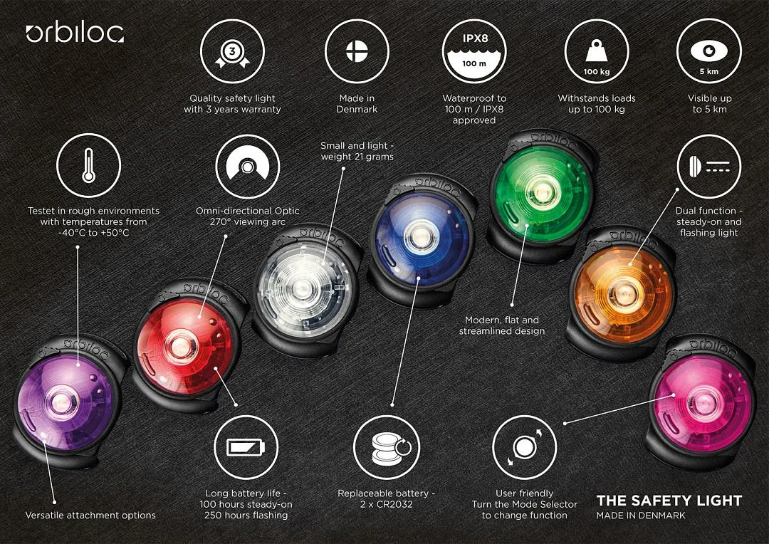 De Orbiloc lampjes zijn verkrijgbaar in verschillende kleuren. De kleurkeuze is afhankelijk van wanneer je het lampje wilt gebruiken en van de weercondities. Daarnaast kun je jouw hond onderscheiden dankzij een gekozen kleur of de kleur afstemmen op de hondenlijn, de halsband of het harnas.