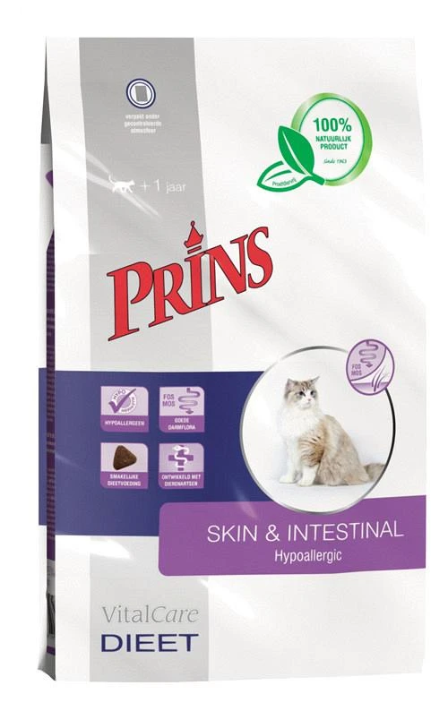 Speciaal voor volwassen katten met een voedselovergevoeligheid (huid- en vachtproblemen) en/of ter ondersteuning van maag-darmproblemen heeft Prins Petfoods een speciale dieetvoeding ontwikkeld, namelijk: VitalCare dieet Skin & Intestinal Hypoallergic.