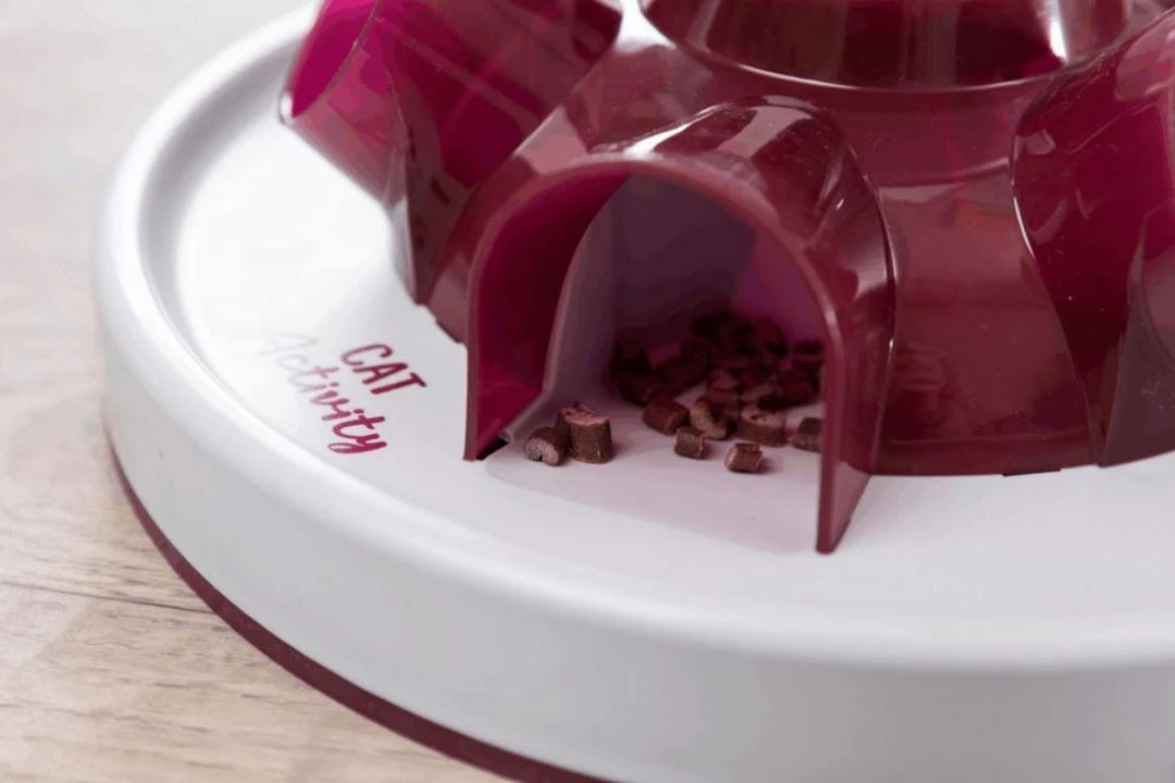 voer valt uit het reservoir en wordt over de 6 buisjes verdeeld de hoeveelheid die wordt uitgegeven, kan zelf worden bepaald er kan ook het dagelijks droogvoer in worden gegeven ontworpen door de kattenexpert Helena Dbalý lichamelijke bezigheid en geestelijke uitdaging schoolt de behendigheid voor katten vanaf 3 maanden kunststof slipvast door rubberen ring ook geschikt voor oudere of zieke dieren